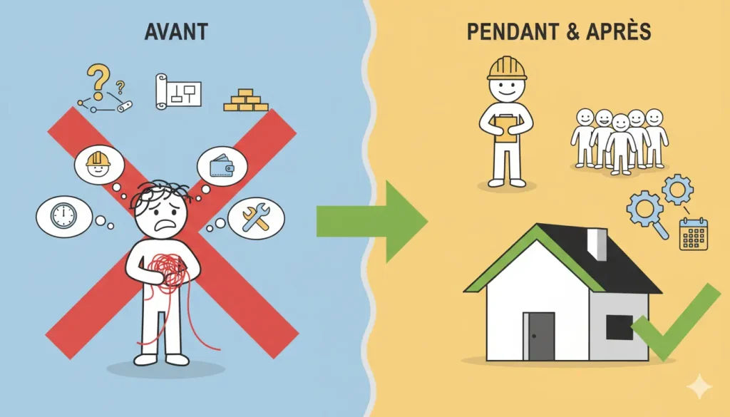 Dans ces projets, un simple artisan isolé suit son lot, sans vision d’ensemble, alors qu’un coordinateur vérifie la cohérence technique et esthétique. Votre maison garde son charme, tout en gagnant en surface, sans mises en danger.
