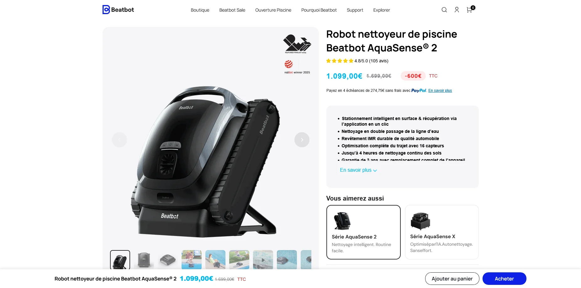 Si votre priorité est d’obtenir un robot sans fil capable de nettoyer plus qu’un simple fond de bassin, le Beatbot AquaSense 2 a des arguments solides. Sa proposition est cohérente : navigation évoluée, bonne autonomie, traitement de la ligne d’eau, application mobile et récupération simplifiée. C’est un produit pensé pour réduire les contraintes, pas seulement pour cocher une case technique.